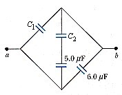 Q- Find the equivalent capacitance between points a and b in the combination of capacitors shown in Figure. C1 = 2.0 µF and C2 = 3.0 µF.